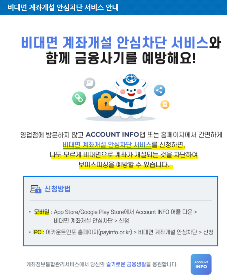 #비대면계좌개설 #안심차단서비스 #명의도용방지 #금융사기예방 #어카운트인포 #신분증도용 #보이스피싱차단 #스미싱예방 #금융보안 #계좌개설차단