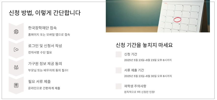 2025년 2학기 국가장학금 1차 신청은 이미 시작되었습니다. 마감 기한을 놓치지 말고, 위에 안내된 소득분위 기준과 계산에 필요한 정보를 바탕으로 미리 준비하여 꼭 신청하시기 바랍니다.